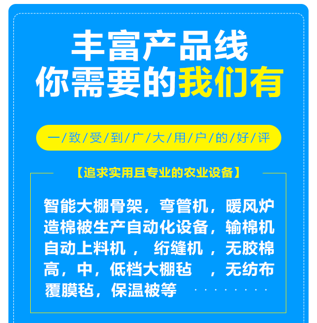 本公司設備齊全,可生產(chǎn)智能大棚骨架,彎管機,暖風爐等農(nóng)業(yè)設備,另制造棉被生產(chǎn)自動化設備,自動上料機,輸棉機,絎縫機等。質(zhì)量可靠,注重創(chuàng)新。公司擁有雄厚的實力,先進的生產(chǎn)線,豐富的經(jīng)驗,可根據(jù)客戶的要求定做高,中,低檔大棚氈,無紡布,無膠棉,覆膜氈,保溫被等,車間日生產(chǎn)新型棉被10000平方米以上,能滿足各種客戶的需求,新型保溫被產(chǎn)品在國內(nèi)研發(fā)中始終保持在前列。