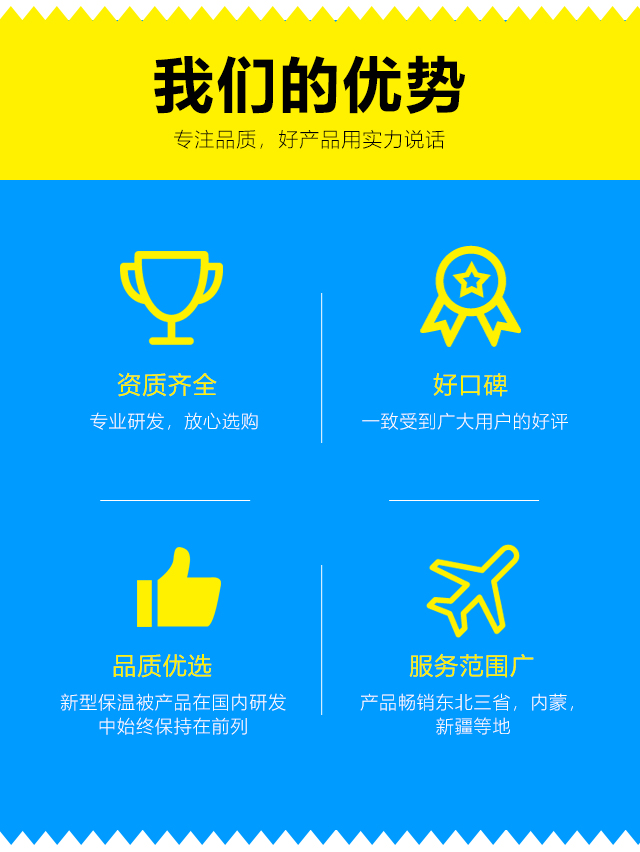 我們本著客戶之上,服務至上的原則,爭創(chuàng)國內(nèi)保溫被行業(yè)的引導者。